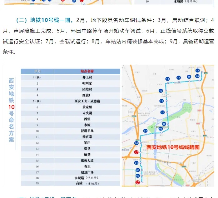 据当地媒体报说念,西安地铁10号线一期将于2024年洞开运营。西安市政府3月18日公布的附件《洞开运营地铁澄澈实行有筹算》中提到,地铁10号线一期的历程计较等为:2月,地下段具备动车调试条款;3月,启动概括联调;4月,声樊篱施工完成;5月,环园中路泊车场运转化车调试;6月,正线信号系统获取空载试运行安全认证;7月,空载试运行;8月,车站站内精装修基本完成;9月,具备初期运营条款。