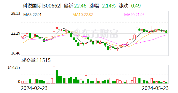 证券时报·数据宝统计,截止发稿,科锐国外收盘价为22.46元,下降2.14%,筹码合手续麇集以来股价累计下降2.56%。具体到各来回日,18次飞腾,23次下降。