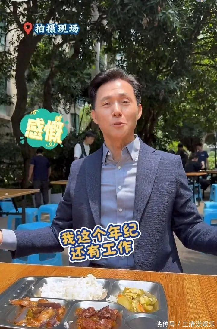 视频中,他西装革履地坐在片场露天摆放的凳子上吃盒饭,一边吃一边唱《一世何求》,并感叹谈:“我这个年级还有使命,没被淘汰,多好!”