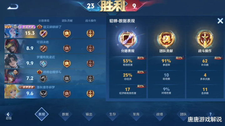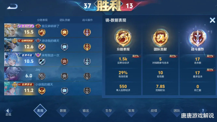 这把用狗尾续蝉赢得15.3评分顶级中路的对局,达到金色评级的进展存7条,而名次前1%的数据高达5条,伤害数值和参团率太亮眼了。