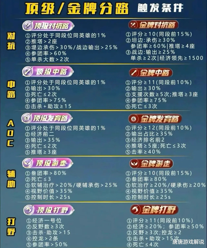 对于评分机制,有一张广为流传的顶级和金牌分路触发图,关联词内容对局中,各个分路对评分影响的要素似乎又莫得那么固定。