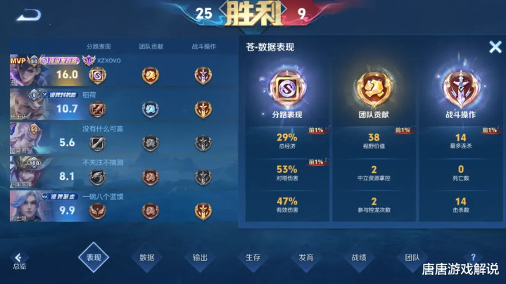 这场使用苍赢得16.0满评分拿下顶级发育路,分路进展中的三项数据太优秀了,然则有一个奇怪的点是47%的有用伤害名次却并不高。