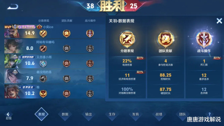 这局14.9评分使用关羽赢得顶级抵抗路,伤害占比22%就名次前1%了,经济滚动伤害达标,若是被打败次数还少,那评分进展就会很高。