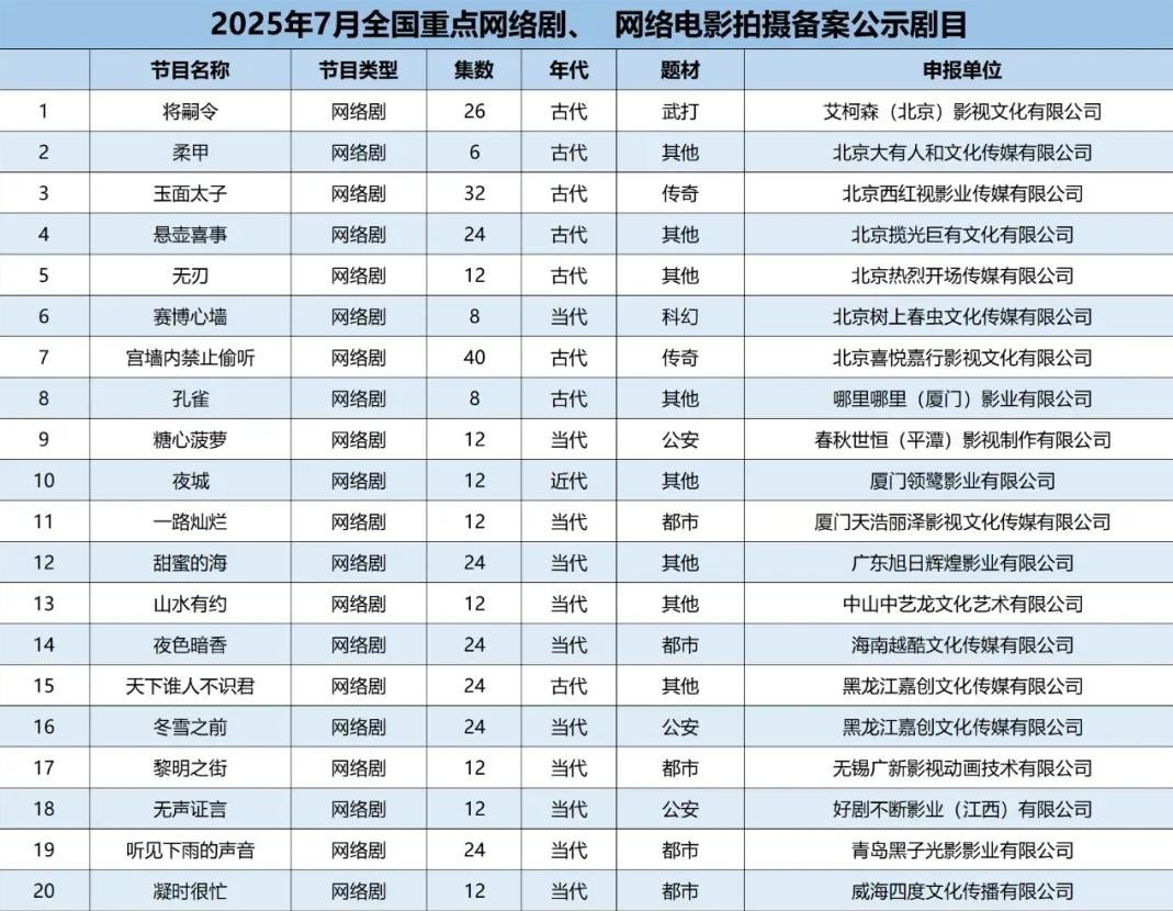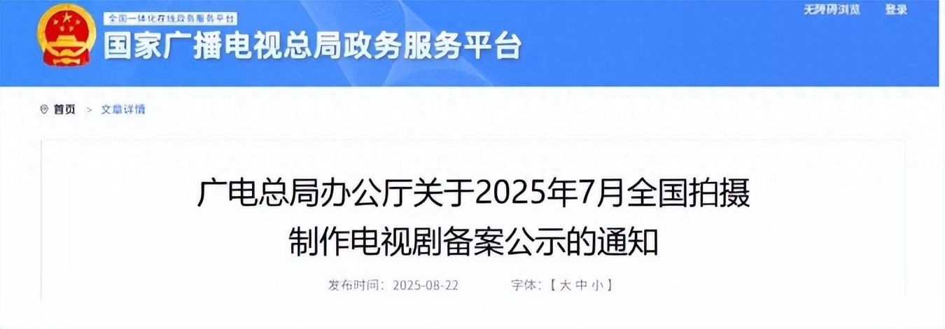 2025年7月寰宇电视剧和要点网罗剧拍摄备案公示情况厚爱公布!
