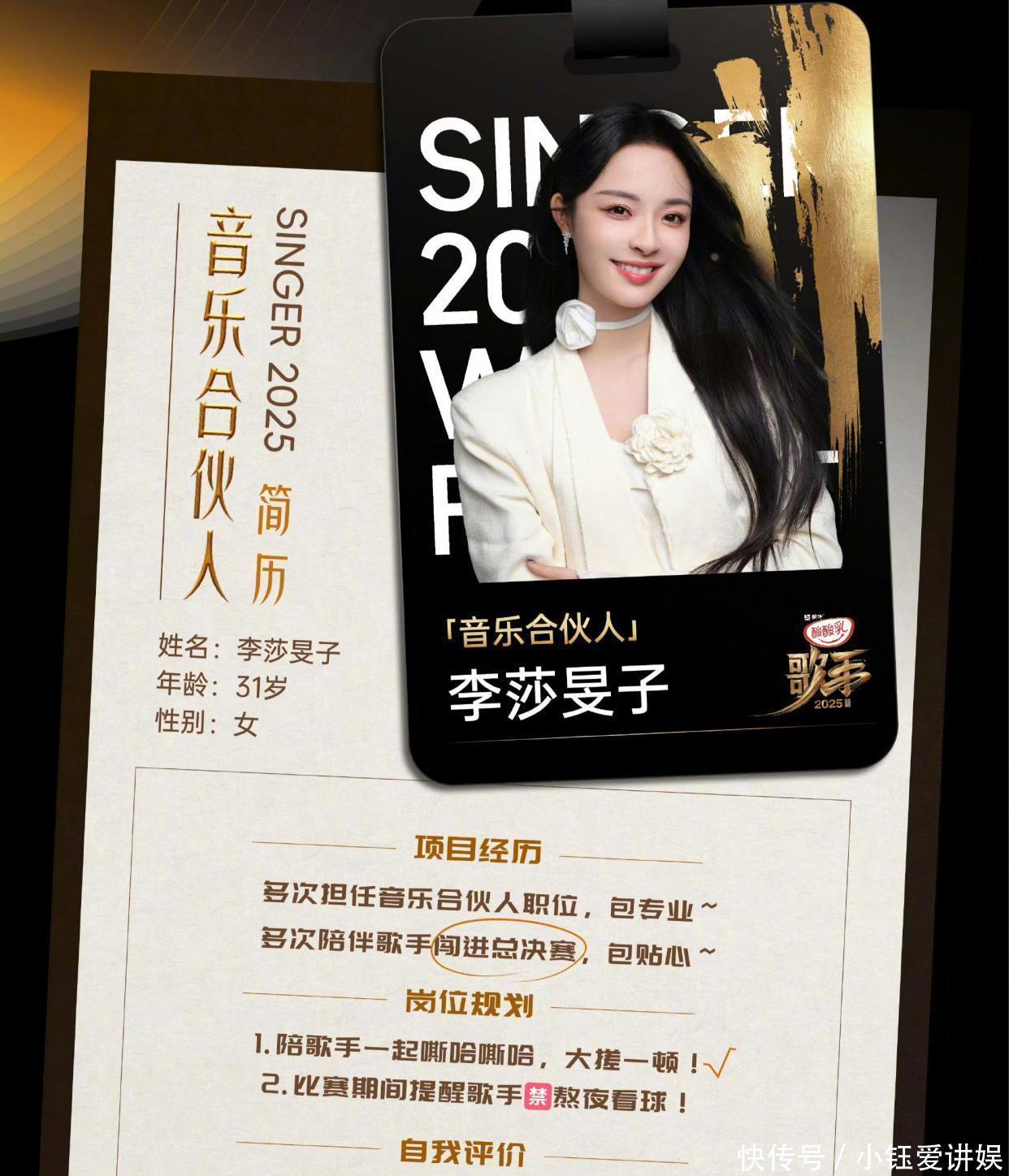 “八朝元老”李莎旻子重磅总结,凭借此前与多位歌手的领略联结,之前有带过两次徐佳莹,还有杨丞琳、克里斯、吉克隽逸、周延、昨年的孙楠,不知说念本年是带谁呢?