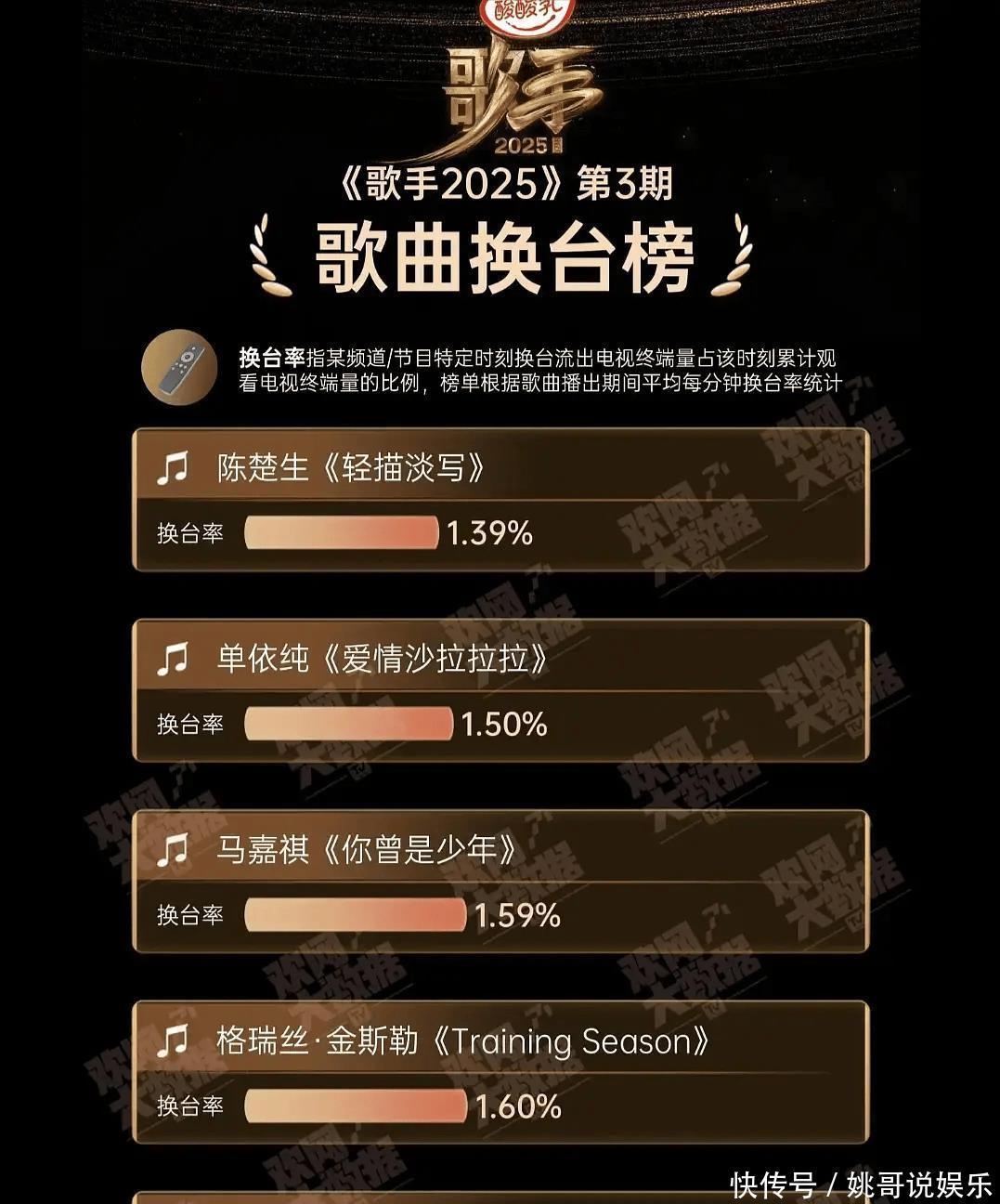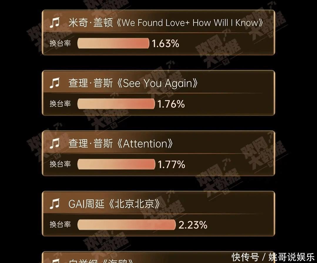 而GAI的换台率其实很高,诚然他的收视增幅高,在他唱歌的技艺好多不雅众皆采取了不雅看一下,然而换台率也高,也评释一部分不雅众不可爱GAI的这首改编,更为领受的是单依纯、陈楚生这种类型的曲风。