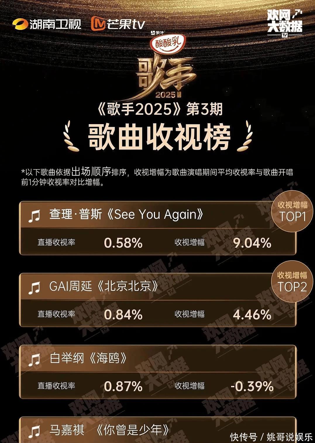 在整个歌手的收视榜中星空体育官方登录,除了查理普斯外,即是GAI的收视最高,收视增幅高达4.46%,排在7位歌手第一的位置。