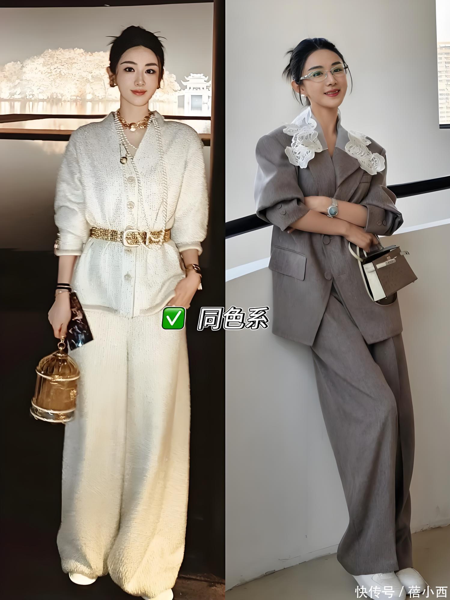 基础色的同色系搭配是薇娅秋季搭配中的高频遴荐,比如米色小香风套装,灰色西装套装,从新到脚激情顺顺当当,无须费脑想搭配,还自带和蔼高档感。如果以为同色系太素,不错搭配一两种漂后的配饰点缀,用极少点亮色就能让举座造型活起来,又不会显得夸张。