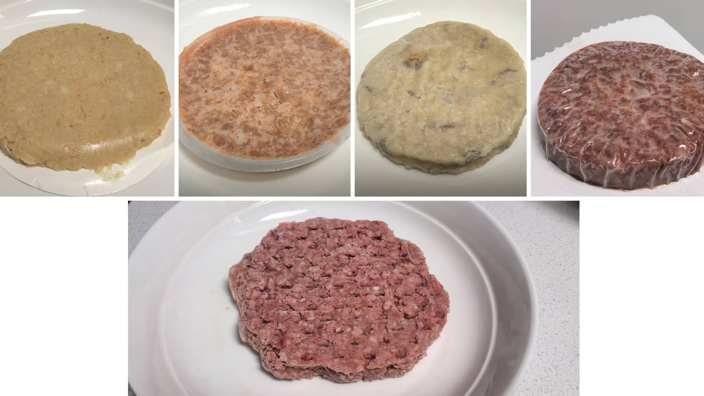 “行业洗牌”中留存下来的植物肉居品,其口感、风范究竟怎么?新京报记者以植物肉中较为常见、能较好体现植物肉自己风范的“肉饼”形态作为切入点,在网上随即购买了4块植物肉饼,并以1块“泰森”安格斯牛肉饼作为真肉肉饼对照,邀请破钞者共同试吃。