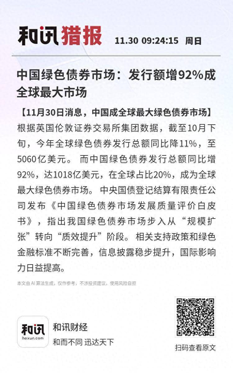 【11月30日音尘,中国成公共最大绿色债券市集】凭证英国伦敦证券交游所集团数据,限度10月下旬,本年公共绿色债券刊行总和同比降11%,至5060亿好意思元。而中国绿色债券刊行总和同比增92%,达1018亿好意思元,在公共占比20%,成为公共最大绿色债券市集。中央国债登记结算有限拖累公司发布《中国绿色债券市集发展质料评价白皮书》,指出我国绿色债券市集步入从“范围膨胀”转向“质效普及”阶段。干系营救策略和绿色金融边幅不休完善,信息线路稳步普及,海外影响力日益提高。
