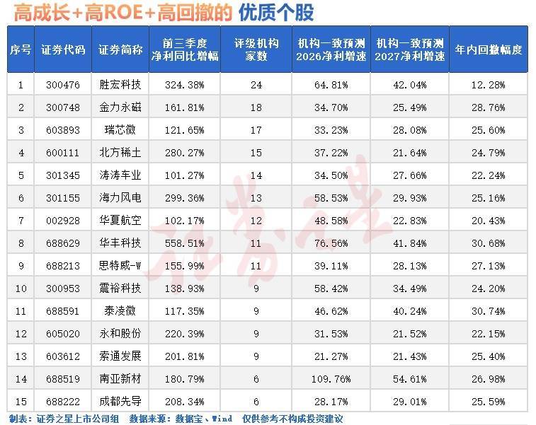 据统计,取得5家以上机构评级且三季报净利同比翻倍增长、扣非平均净钞票收益率超5%的个股中,有15只个股机构一致预测光辉两年净利增速均超20%,且最新价较年内高点回调超20%。