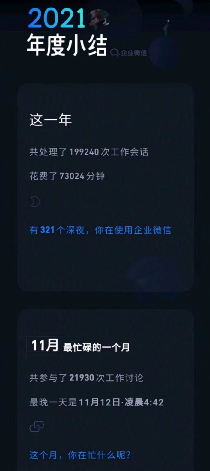 据上述微博用户共享的骸骨在2021年12月31日发布的年度小结,图片高慢,该职工在昔日一年的321个夜深都在使用企业微信,最晚一天神命到凌晨4:42。